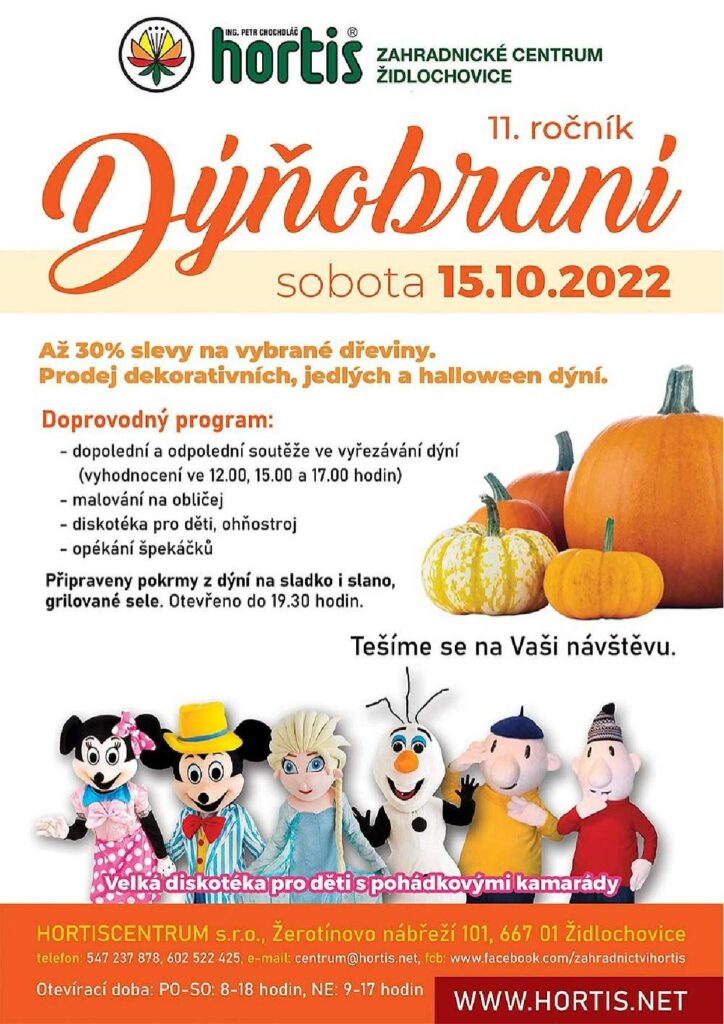 11. ročník Dýńobraní v zahradnickém centru Hortis , sobota 15.10.2022 s doprovodným programem, otevřeno do 19:30 hod.