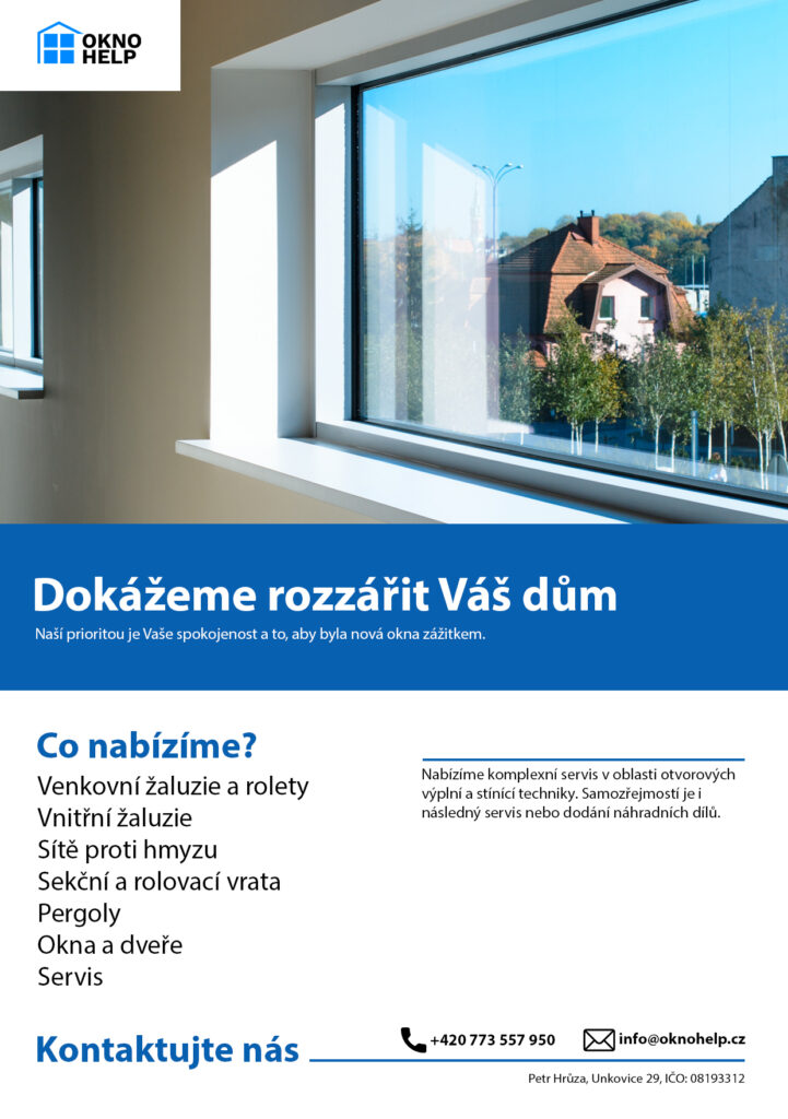 Firma Okno Help – Petr Hrůza nabízí: venkovní žaluzie a rolety, vnitřní žaluzie, sítě proti hmyzu, sekční a rolovací vrata, pergoly, okna a dveře, servis