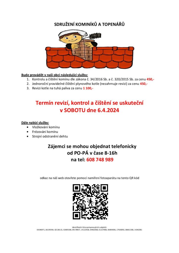 bude v SOBOTU 6.4. 2024 provádět požadované kontroly a čištění komínů dle zákonu č. 34/2016 Sb. za 450 Kč, čištění plynových kotlů za 450 Kč a revize kotlů na tuhá paliva za 1 100 Kč. Dále nabízí vložkování a frézování komínů.
