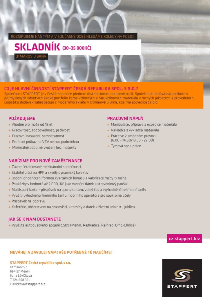 kontakt: Ilona Lávičková 724668 361, email: i.lavickova@stappert.biz