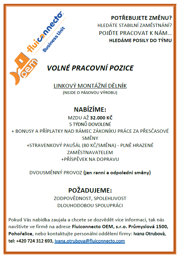 Fluiconnecto OEM s.r.o. nabízí volné prac. pozice: linkový montážní dělník