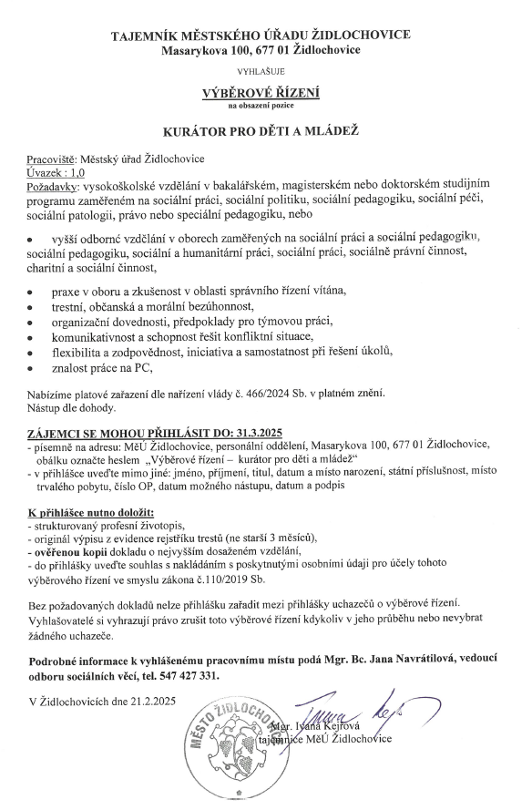 práce - kurátor pro děti a mládež - MěÚ Židlochovice