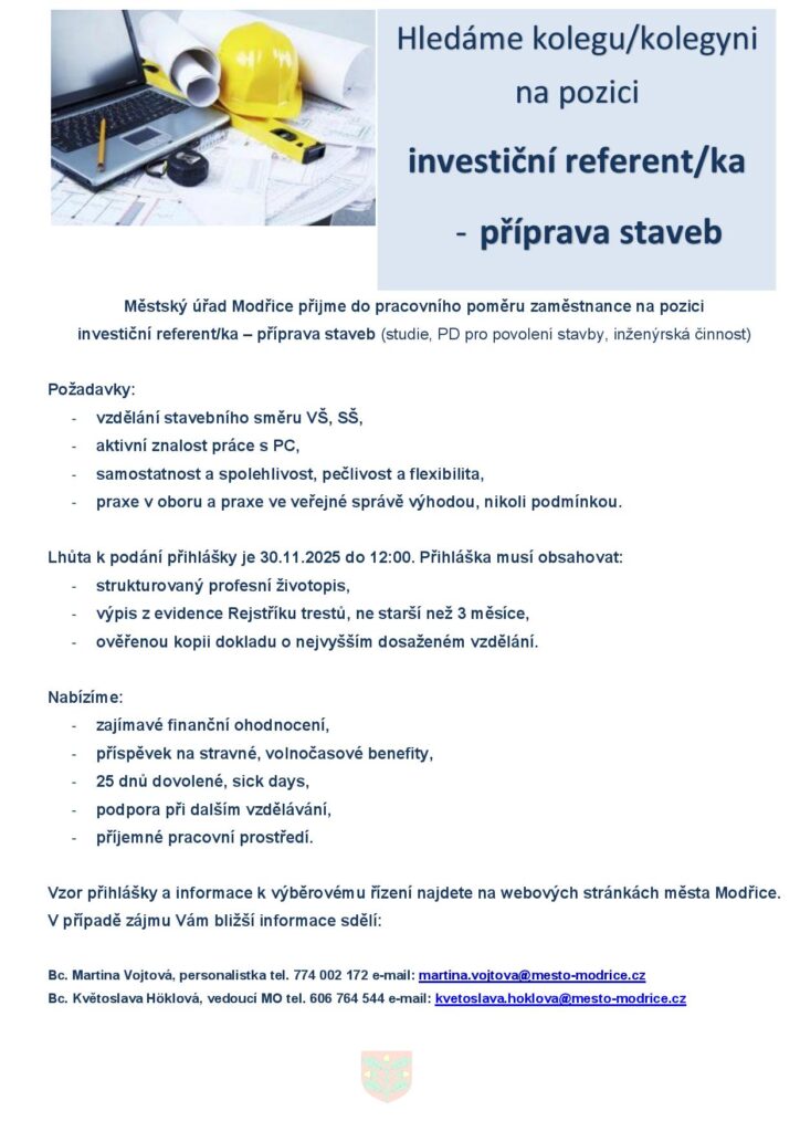 MěÚ Modřice přijme do pracovního poměru investičního referenta – příprava staveb (studie, PD pro povolení stavby, inženýrská činnost)