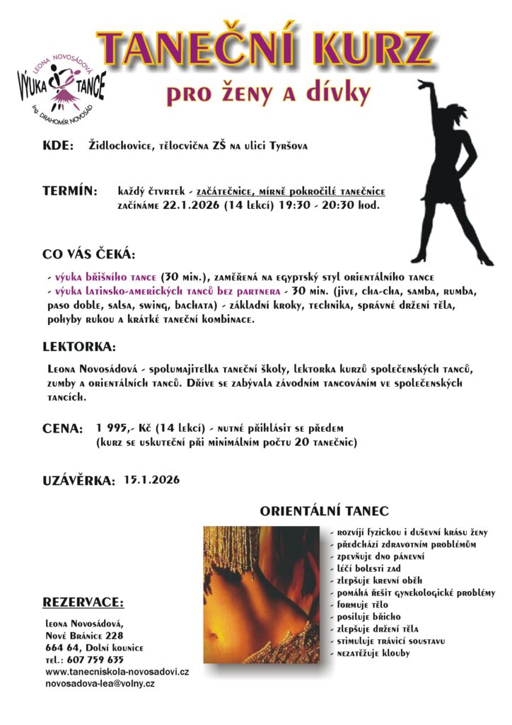 Leona Novosádová zve na taneční kurz pro ženy v Židlochovicích s výukou latinsko-amerických a orientálních tanců, první lekce se koná 22.1.2026, uzávěrka přihlášení je 15.1.2026.