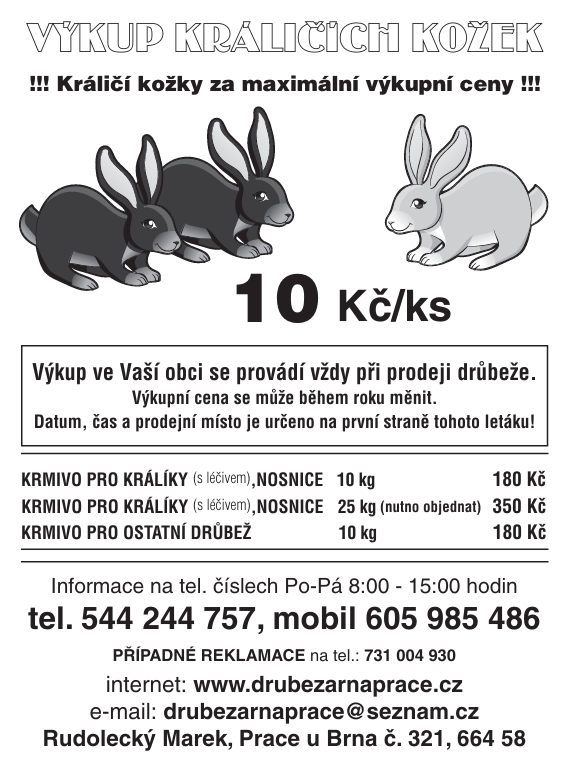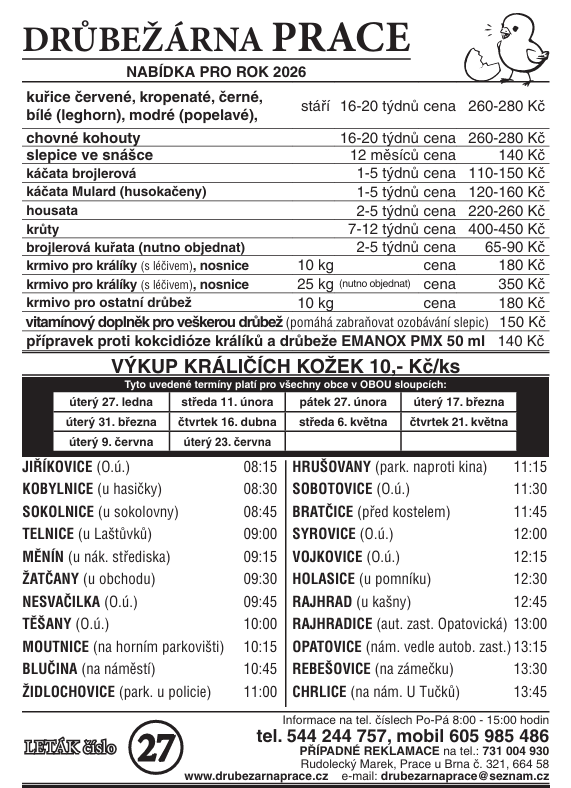 Drůbežárna Prace bude v ÚTERÝ 27. 1. 2026  ve 12:45 hod.