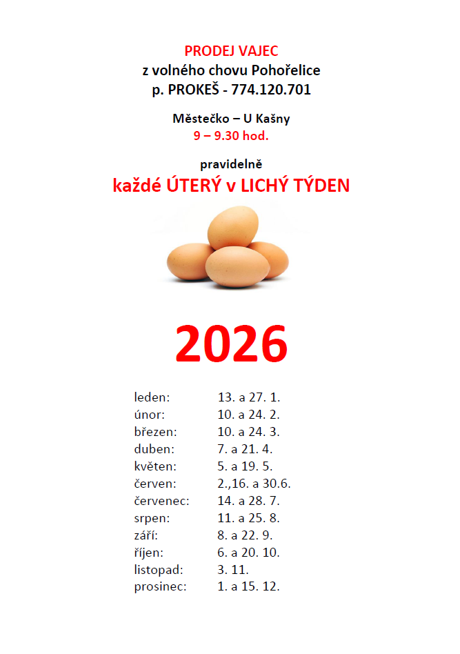 VEJCE z volného chovu Pohořelice, p. PROKEŠ z Přibic / celoročně každé liché úterý 2026 v 9-9.30 hod. / Městečko – prodej z auta