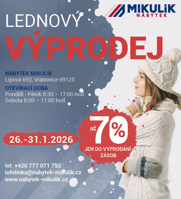 Od 26. do 31. ledna 2026 probíhá v Nábytku Mikulík ve Vranovicích lednový výprodej – slevy až 70 % na kvalitní český nábytek