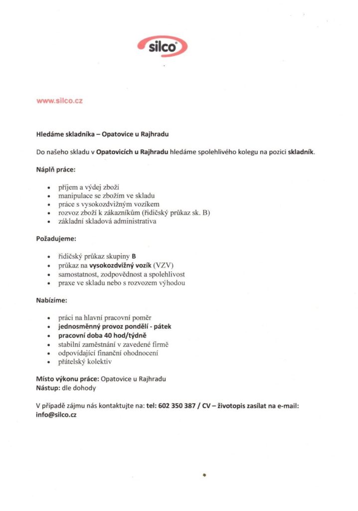 Kontakt na tel.: 602 350 387 / CV – životopis zasílejte na e-mail: info@silco.cz