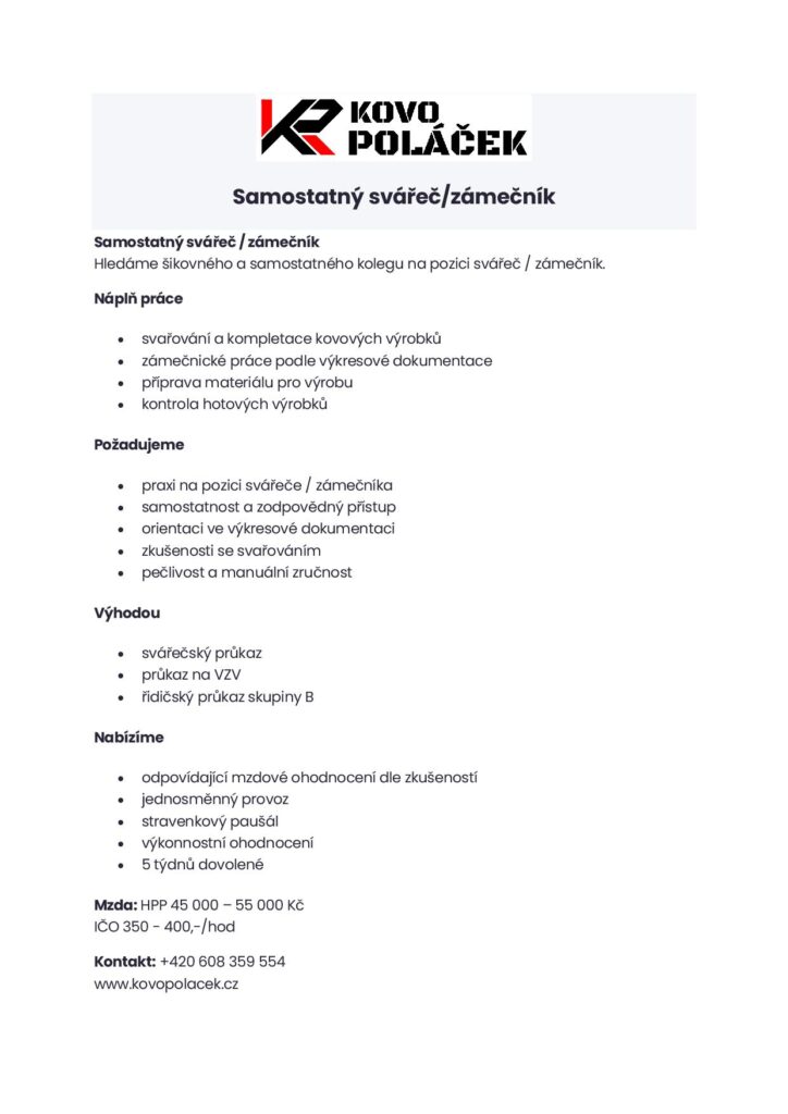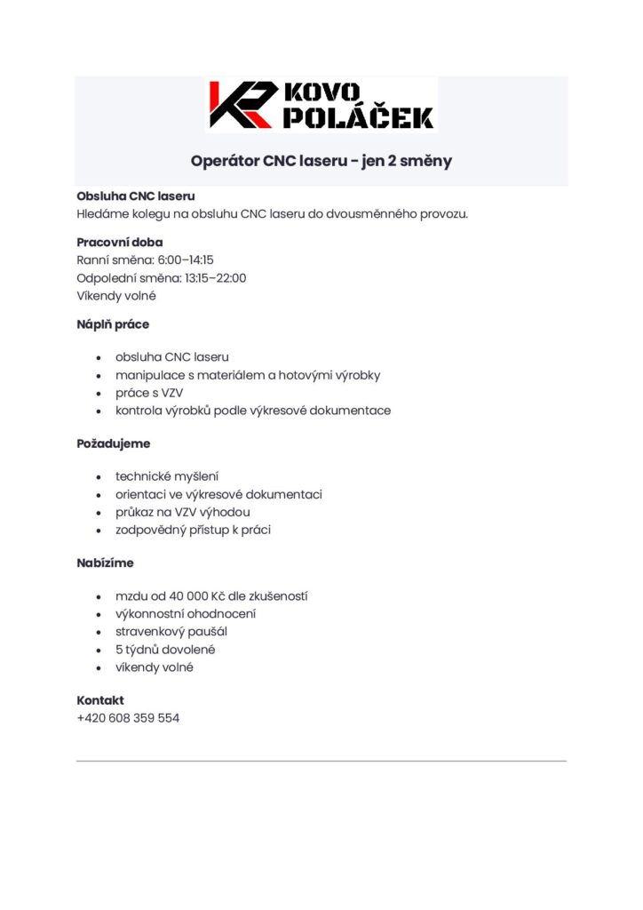Kovopoláček s.r.o. Nesvačilka hledá nové zaměstnance na pozice zámečník, svářeč a operátor CNC laseru.