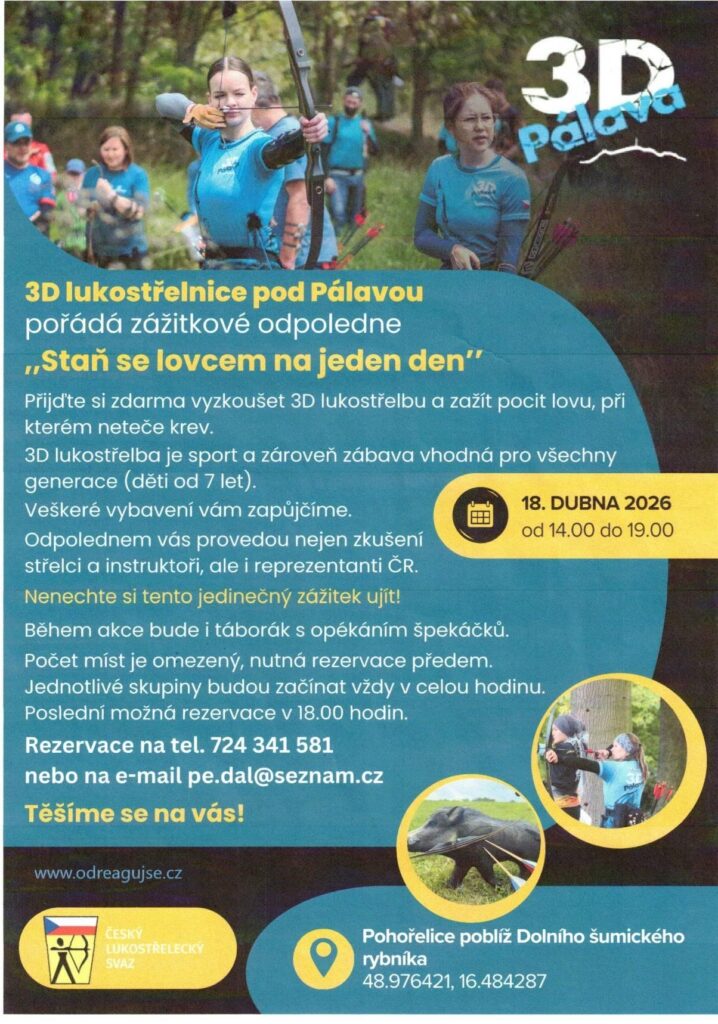 3D lukostřelnice pod Pálavou pořádá zážitkové odpoledne 18.04.2026 od 14.00 do 19.00 hod.