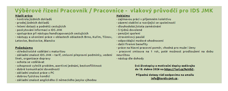 Výběrové řízení na pracovní pozici vlakový průvodčí pro IDS JMK