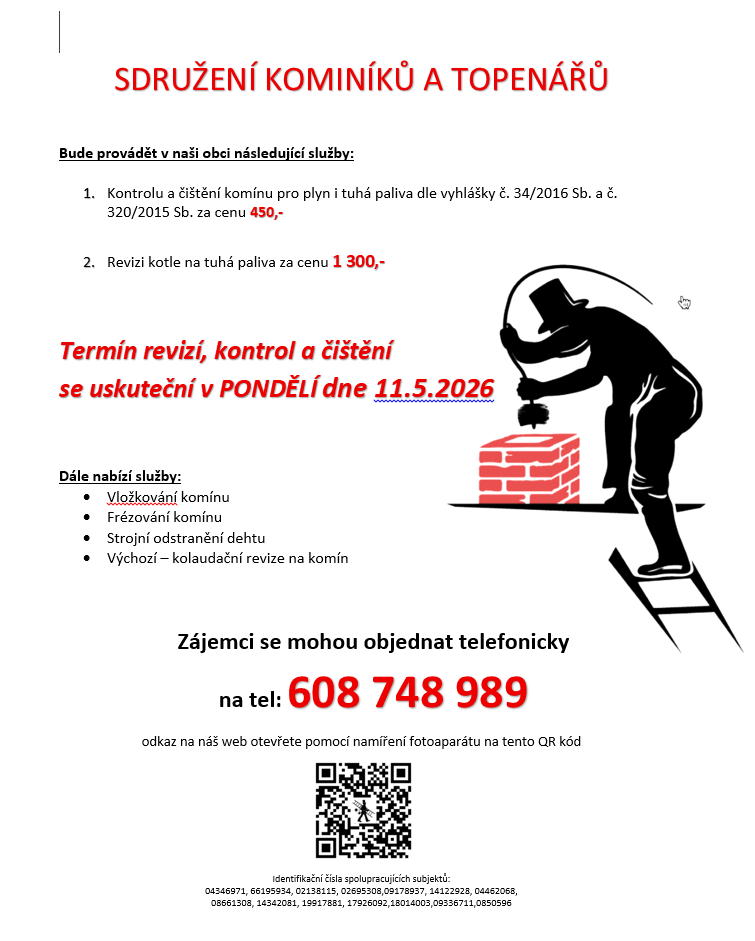 Sdružení kominíků a topenářů bude provádět v naší obci v PONDĚLÍ dne 11.5. požadované kontroly a čištění komínů pro plyn i tuhá paliva dle zákonu č. 34/2016 Sb. za následující ceny: